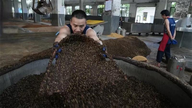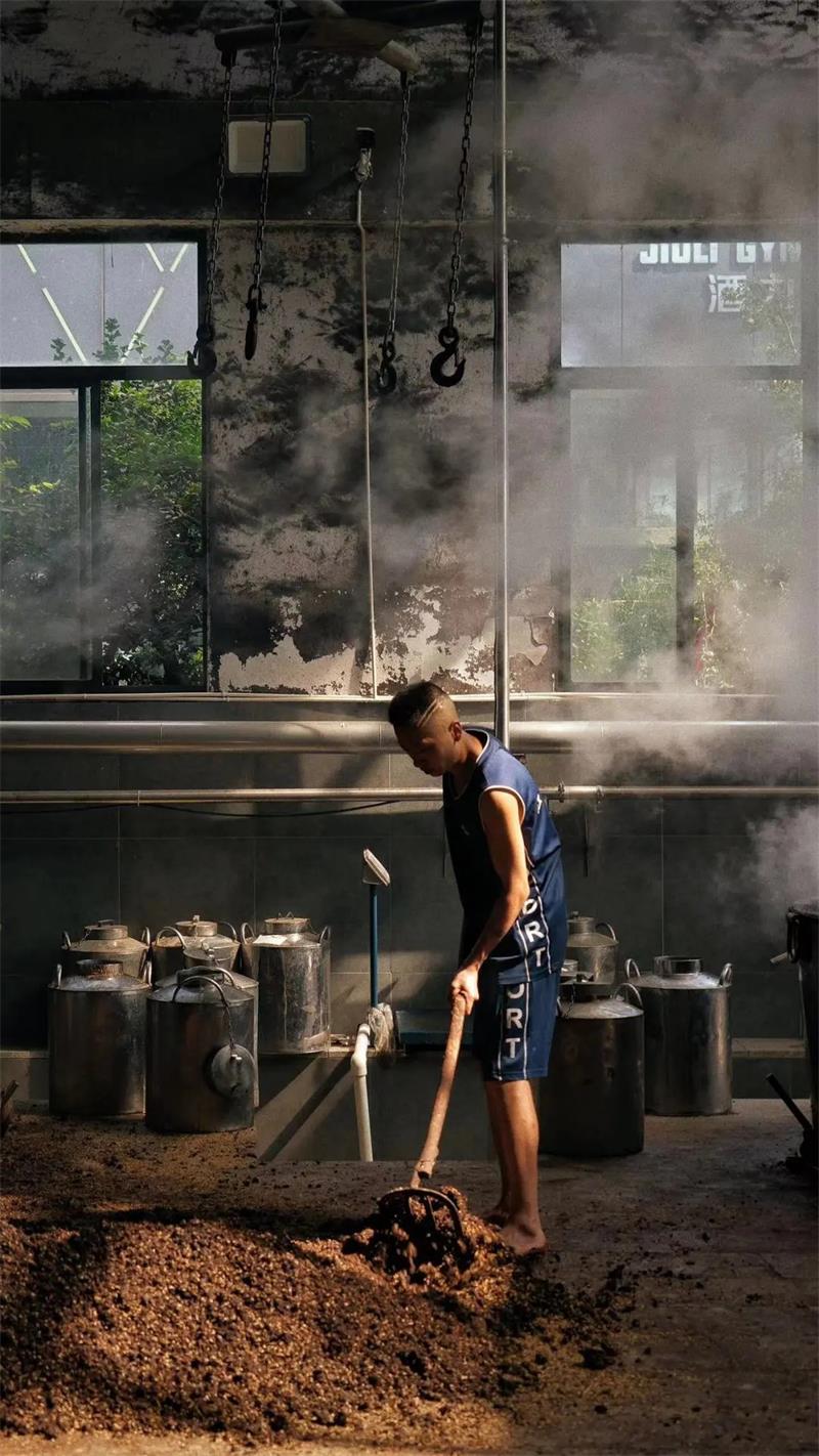 工廠,釀酒工人們正將發(fā)酵后的紅高粱放