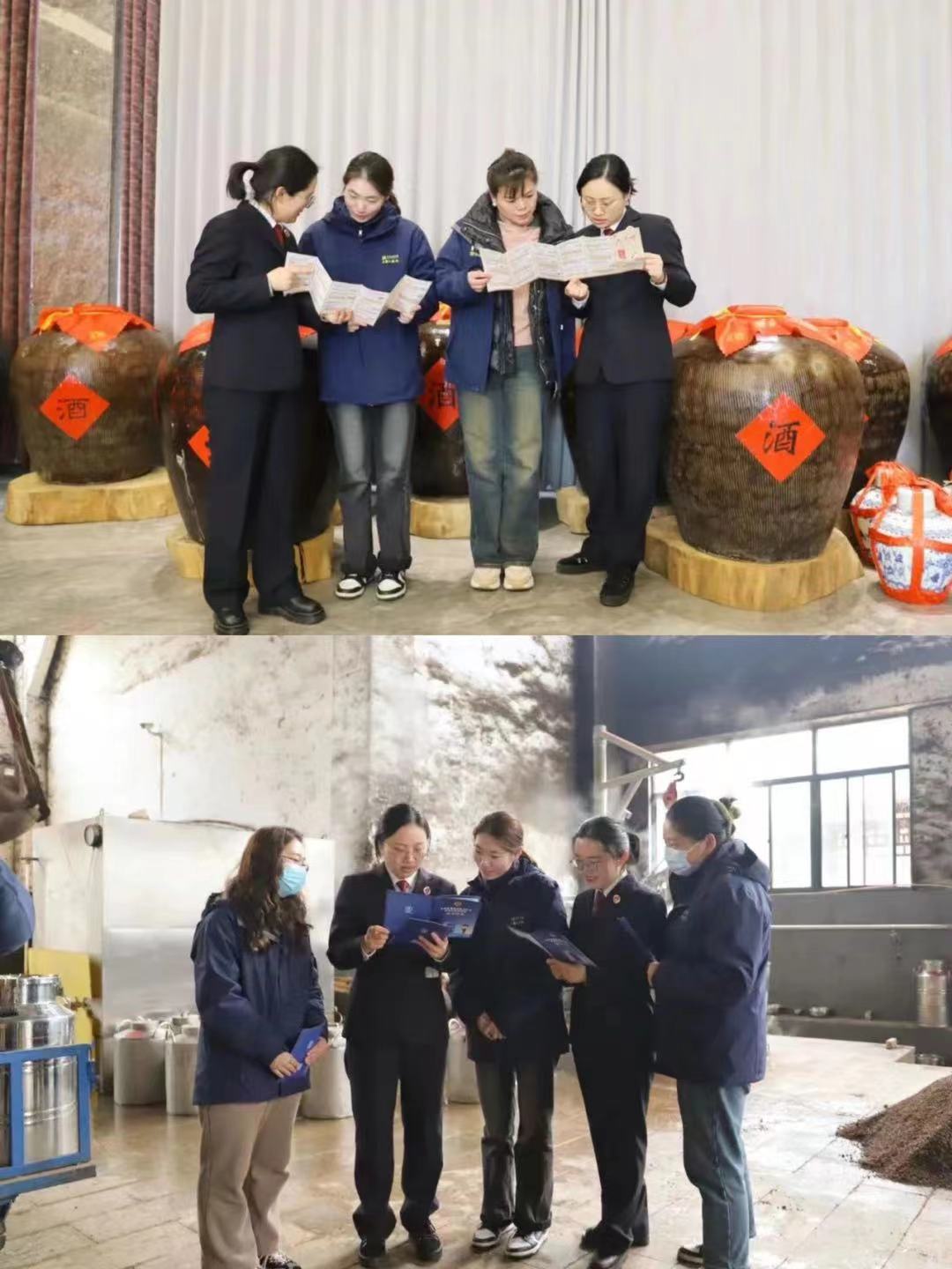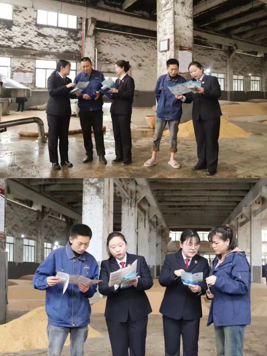 法律服務(wù)團一行來到玉祁酒業(yè)車間,與生產(chǎn)一線的工人師傅親切交流,她們觀看釀酒師傅現(xiàn)場展示白酒釀制技藝,了解生產(chǎn)經(jīng)營情況,向公司相關(guān)管理人員宣傳刑事、民事、行政、公益訴訟等檢察職能,普及《民法典》等法律法規(guī),為企業(yè)發(fā)展提供法治保障。